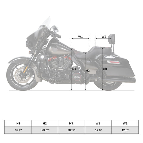 (except 2023-later Electra Glide Highway King, CVO Street Glide, CVO Road Glide, Road Glide 3 models, nor 2024-later Street Glide, Road Glide and CVO Road Glide ST) - Front width: 14.76''. Rear Width: 12.69''